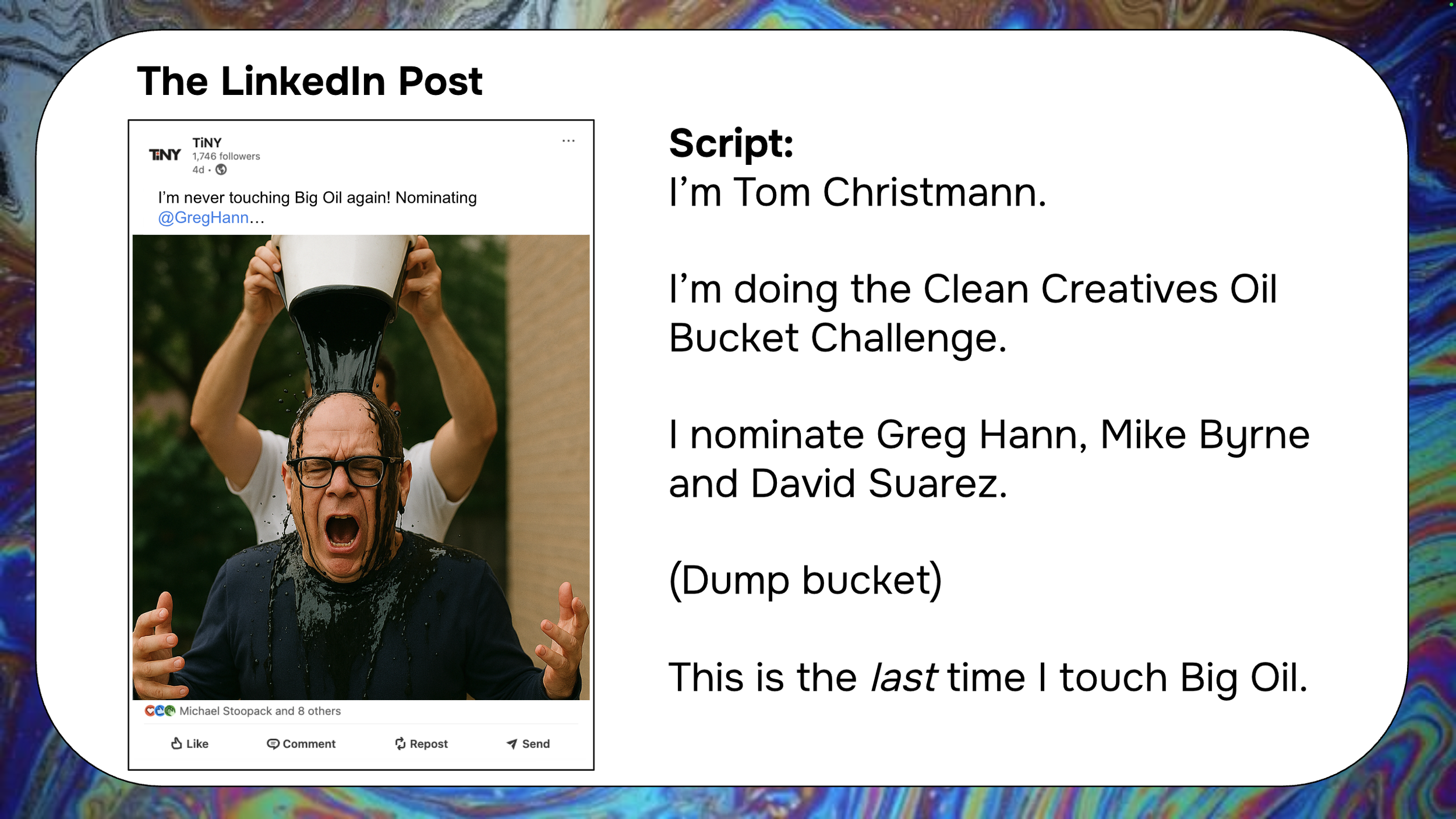 I won the Clean Creatives Unpitch Fossil Fuels contest with a campaign called The Oil Bucket Challenge.